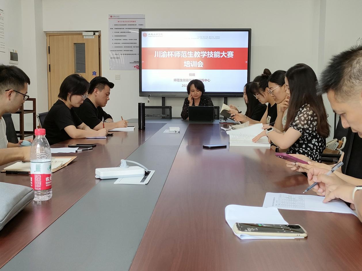 2023年9月8日13:00,师范生教学技能与素养实训中心主任杨娟在A407师生沙龙活动室主持召开“川渝杯”师范生教学技能大赛培训会。文法学院、教育学院、外国语学院、马克思主义学院、以及体育与医护学院、信息工程学院相关指导教师代表参会。